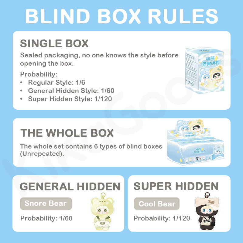 3. The production ratio of general hidden mini-figures (Snore Bear) is 1/60, the production ratio of super hidden mini-figures (Cool Bear) is 1/120.