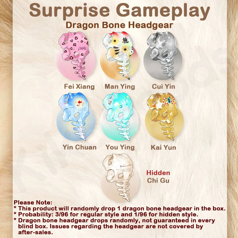 - Dragon bone headgear drops randomly, not guaranteed inevery blind box. Issues regarding the headgear are not coveredby after-sales.